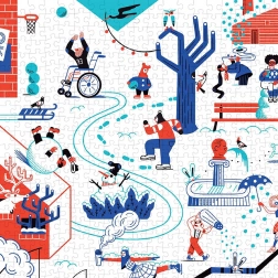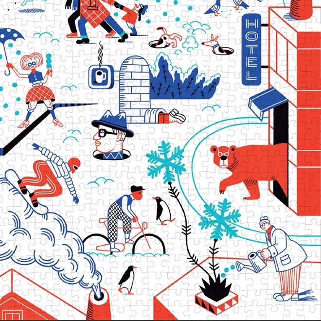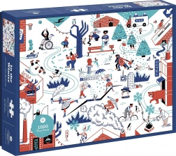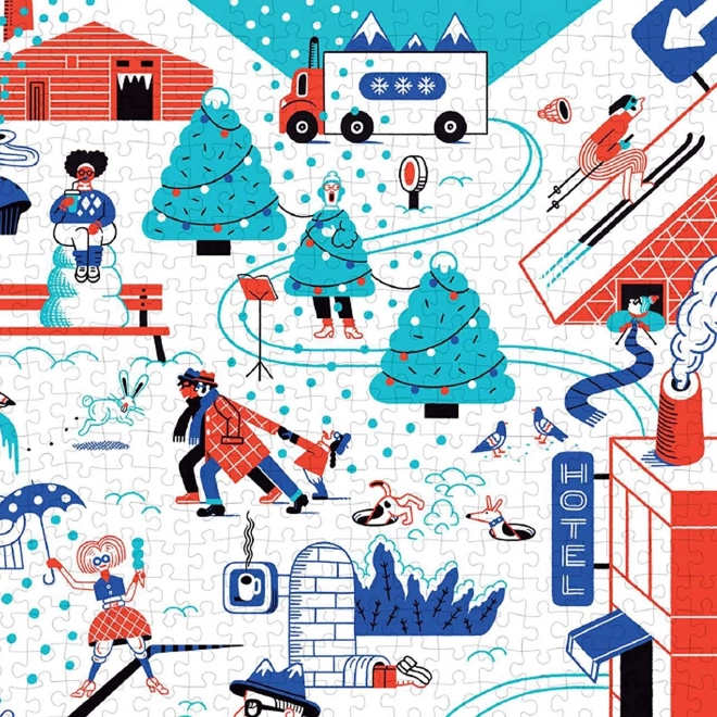 Il puzzle offre una visione allegra di un mondo invernale pieno di attività come sci e pattinaggio.