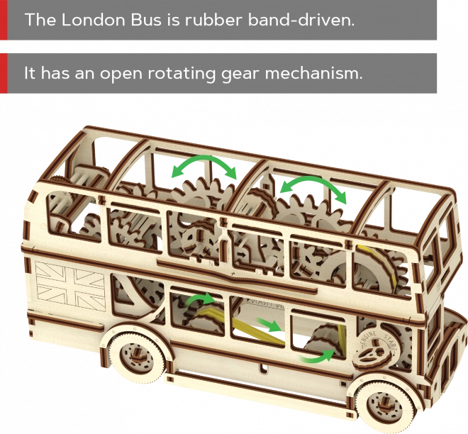 Il modello dell'autobus londinese non è solo un simbolo dei viaggi londinesi, ma anche il regalo perfetto per ogni occasione. Include un meccanismo di rotazione assemblato a mano ed è alimentato da un motore a gomma, che simula un movimento reale. Contribuisci al tuo nuovo hobby e scopri l'eleganza classica senza imballaggi in plastica.