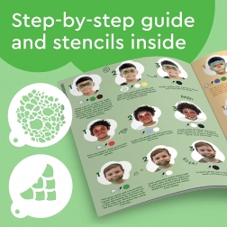Il set include 8 colori di alta qualità, stencil per creare facilmente motivi, spugne, pennello e una guida illustrata per principianti e utenti esperti. Si lavano facilmente con acqua e sapone, assicurando una rimozione semplice.