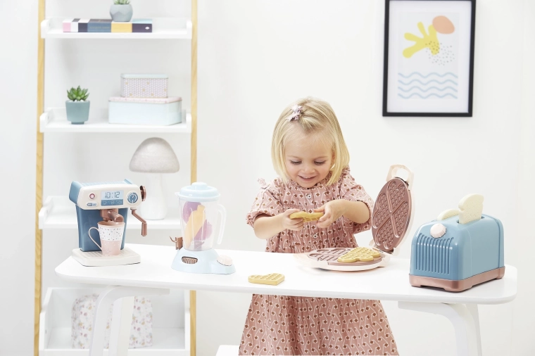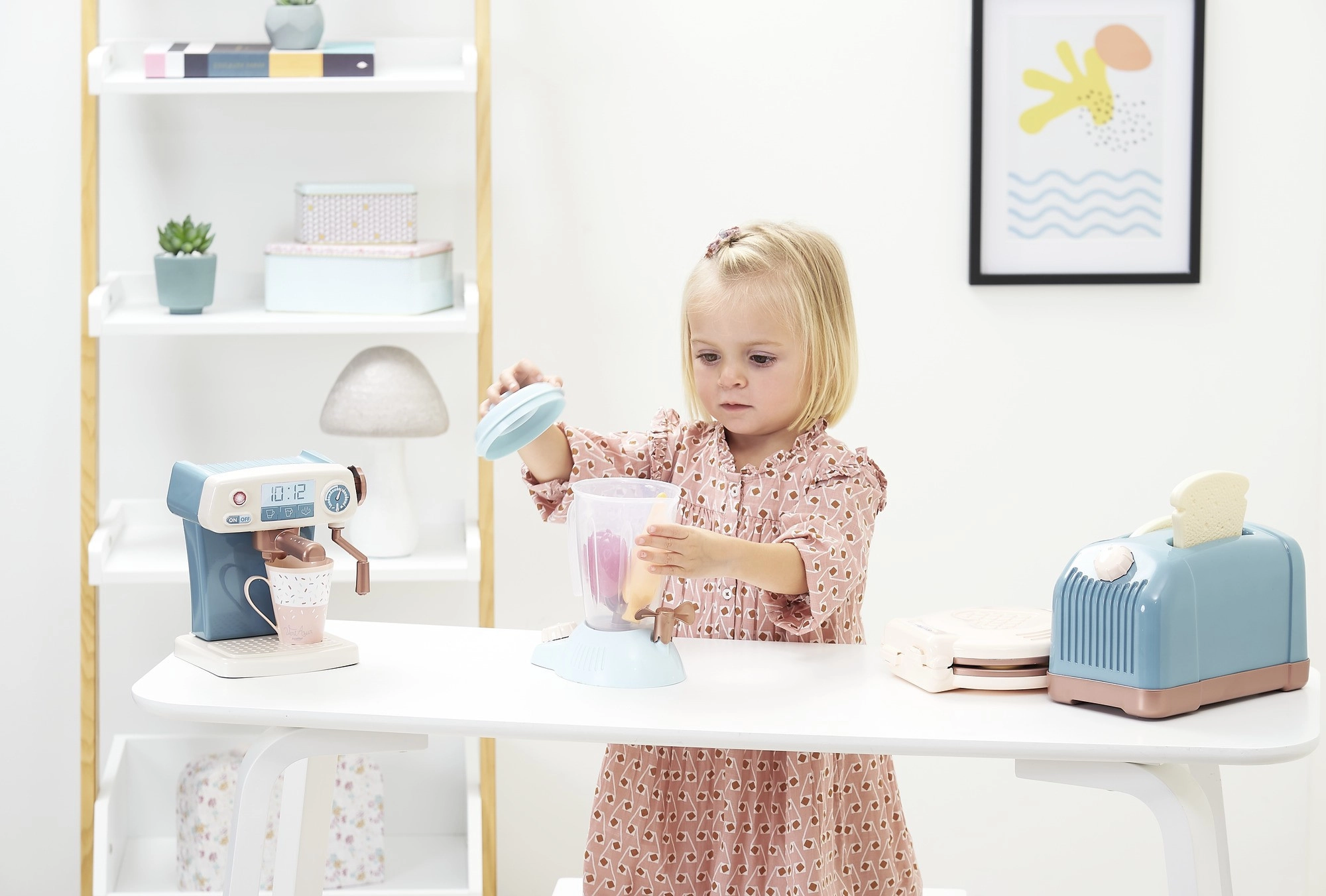 Questo set elegante per piccoli cuochi offre tutto ciò di cui i bambini hanno bisogno per imitare i grandi in cucina. Il tostapane con “fette”, la macchina del caffè realistica, la graziosa piastra per waffle e il frullatore trasparente invitano a “cucinare”, servire e mangiare insieme in modo giocoso. Supporta concentrazione, pensiero logico e coordinazione occhio‑mano.