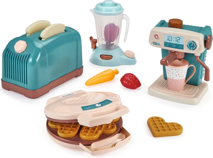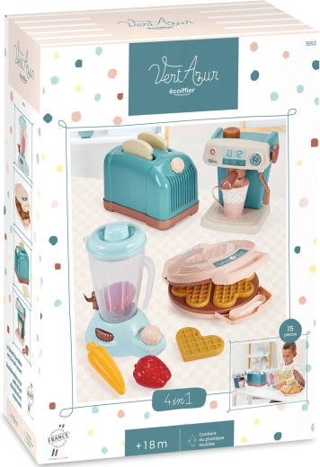 Scopri il mondo creativo della cucina con il set da cucina per bambini ECOIFFIER Vert Azur – tostapane, macchina del caffè, piastra per waffle e frullatore completi di 15 pezzi di accessori. Il set stimola fantasia, motricità fine e gioco di ruolo, ha elementi mobili ed è realizzato in plastica di qualità nei moderni colori blu‑marrone.