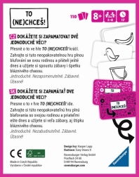 To (ne)chceš! è un gioco di festa semplice e genialmente progettato che ti mostra quanto sia facile ingannare il tuo cervello e al contempo farti ridere. Le sue regole di gioco consentono la scelta di diversi livelli di difficoltà, rendendo il gioco accessibile sia ai principianti sia ai giocatori esperti. Se hai voglia di giocare solo in due, il gioco ha regole adattate anche per questa variante.
