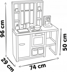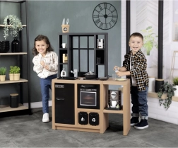La cucina SMOBY Loft in stile industriale si integra perfettamente negli interni moderni e offre ai bambini uno spazio sicuro per imitare la cucina reale. Le manopole girevoli, le ante apribili e i vani pratici favoriscono il gioco di ruolo, l’autonomia e l’interazione sociale.