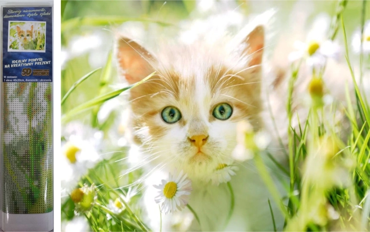 La pittura con diamanti è un ottimo modo per sgomberare la mente e trascorrere il tempo in modo creativo. Il soggetto del gattino tra le margherite illumina qualsiasi ambiente e il quadro finito può essere facilmente incorniciato (la cornice non è inclusa). Non servono abilità artistiche – basta seguire i simboli prestampati sulla tela.