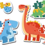 I bambini dai 2 anni possono divertirsi a comporre i primi puzzle a tema dinosauri. Ogni puzzle contiene un diverso numero di pezzi - 2, 3, 4 e 5, consentendo un miglioramento graduale e l'acquisizione di nuove competenze.