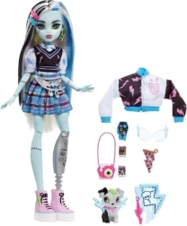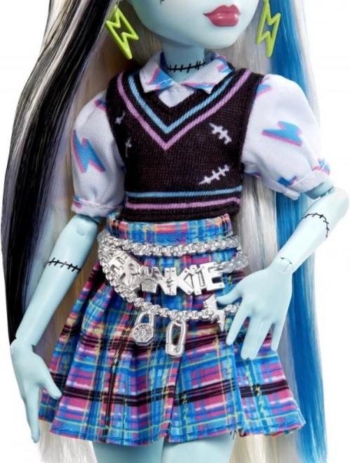 La bambola Frankie Stein è pronta a brillare nei corridoi della scuola con un aspetto unico. Il suo outfit include una gonna a quadri stilosa, camicetta con motivi di fulmini e un gilet, completati da scarpe con plateau e altri accessori come occhiali e orecchini a forma di fulmini.