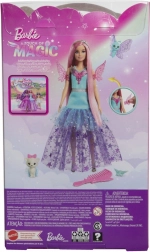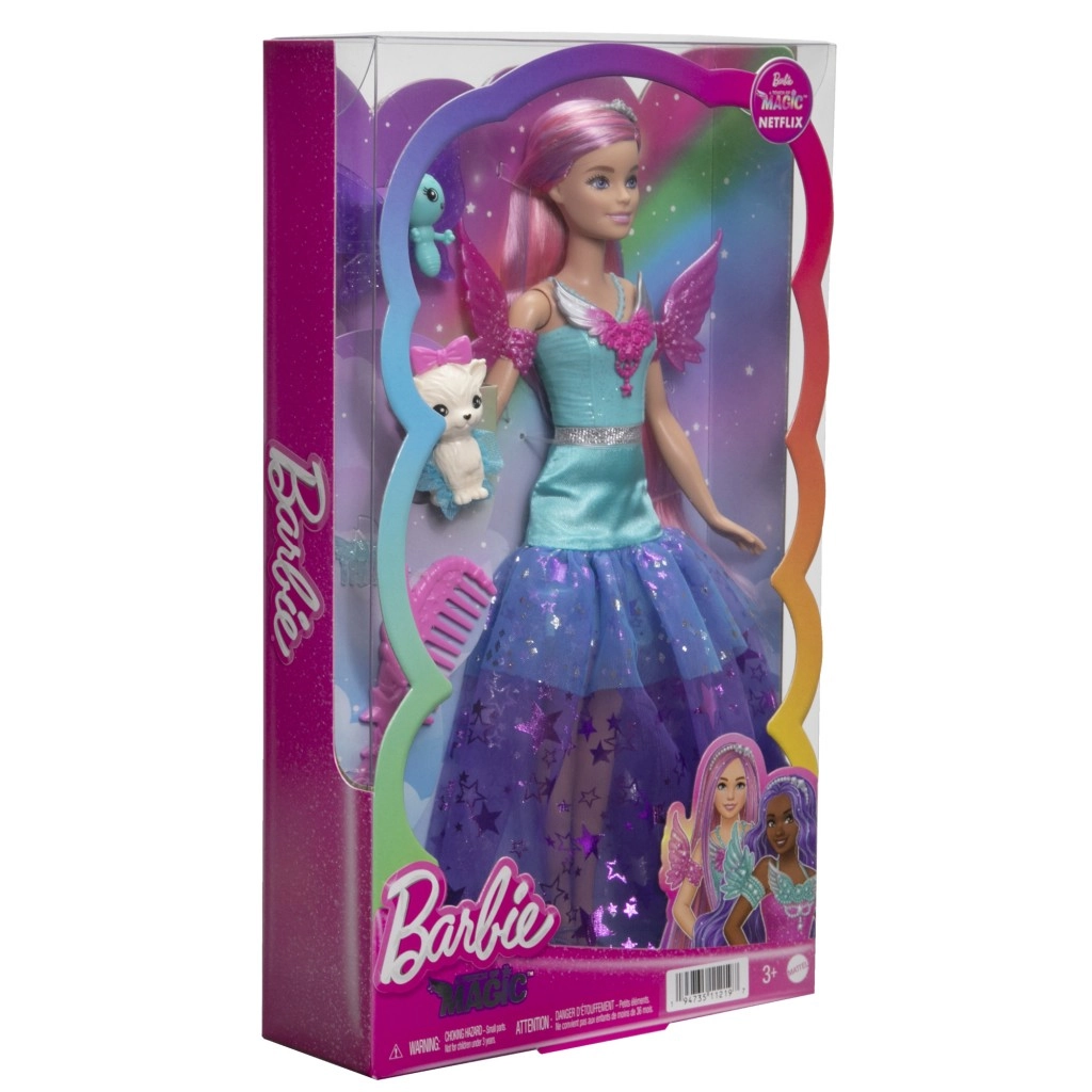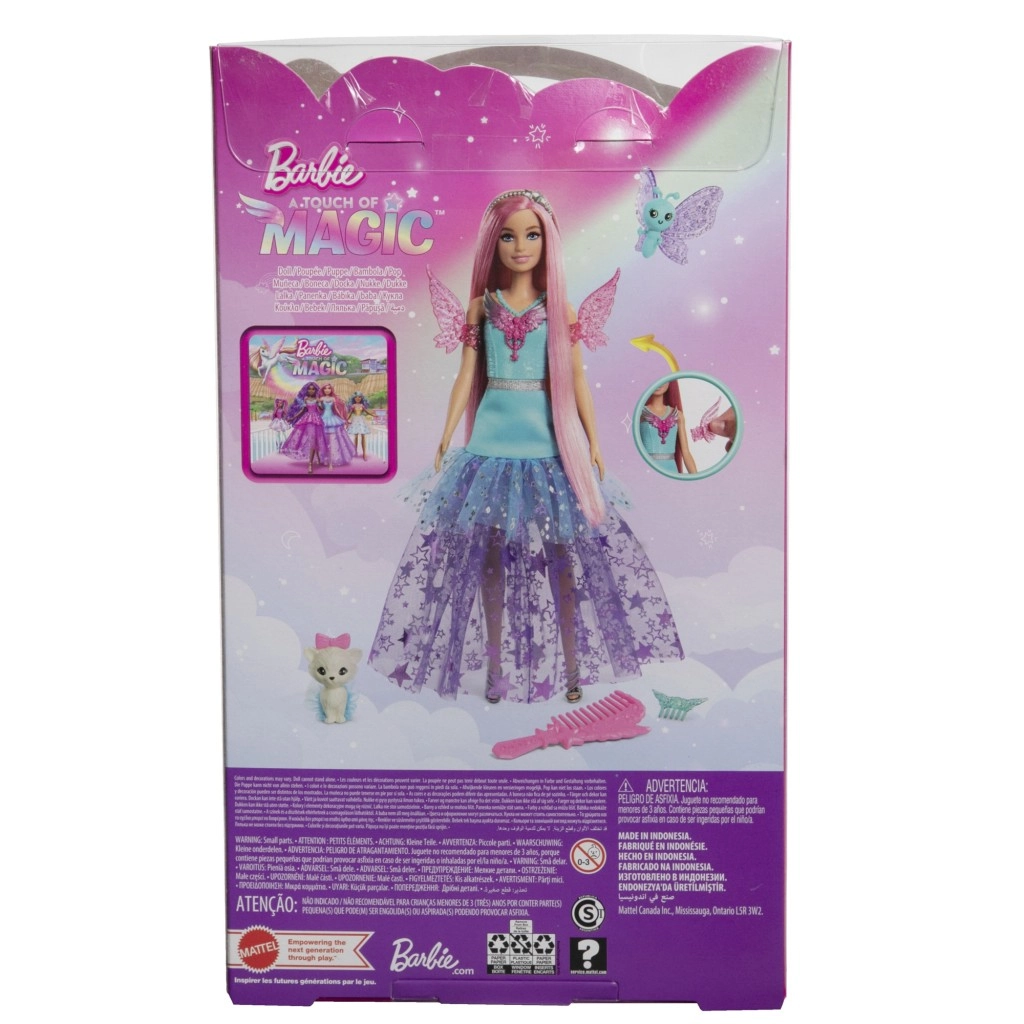 La Barbie Malibu della collezione “Barbie e un tocco di magia” brilla con un magnifico abito in tulle stellato, un cerchietto scintillante e ali rimovibili. I capelli rosa pastello invitano a pettinare e a fare styling, mentre i dolci amici – la farfallina e l’animaletto con tutu – stimolano la fantasia e il gioco narrativo.