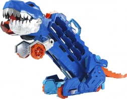 L’unico trasportatore di dinosauri combina un vano per oltre 20 macchinine in metallo con un gioco ricco di azione. In modalità trasporto basta tirare la maniglia e guardare il T‑Rex che “divora” le macchinine lungo il percorso. Con un solo movimento della coda lo trasformi in un T‑Rex meccanico con effetti luminosi e suoni da dinosauro.