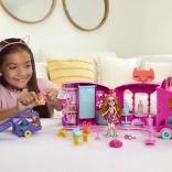 Il negozietto su ruote, una volta aperto, diventa un guardaroba con appendiabiti, manichini e cabina per cambiarsi – la scena ideale per sfilate di moda tutte tue.