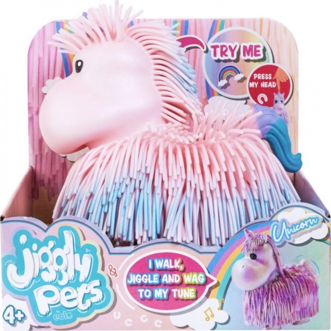 Adorabile unicorno interattivo Jiggly Pets, che prende vita premendo il pulsante sulla testa: cammina, muove la testa, agita il corpo e la coda e riproduce allegre melodie. La sua superficie morbida e frangiata invita al tatto e le batterie sono incluse nella confezione (per uso di prova).