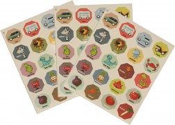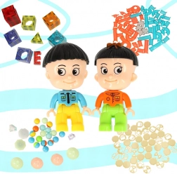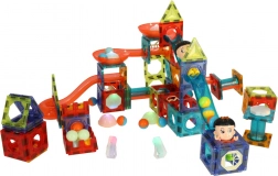 - Biglie x12; Blocchi luminosi x14; Quadrati magnetici x60; Triangoli magnetici x4; Pezzi magnetici a forma di “E” x4; Altri pezzi di varie forme x106; Personaggi x2; Adesivi