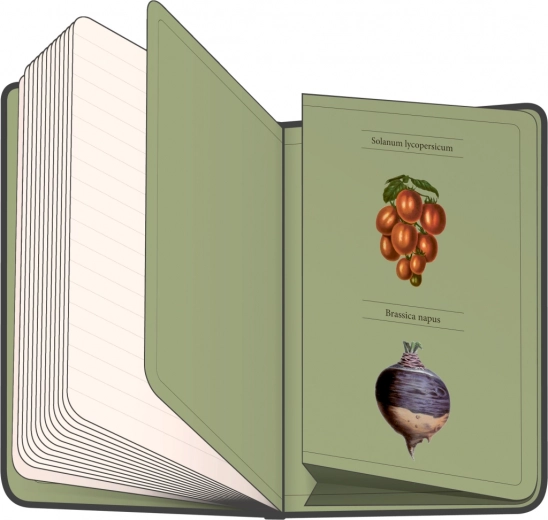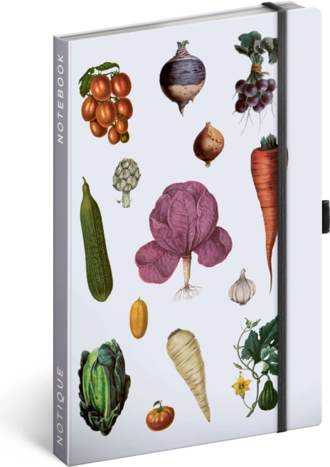 Taccuino con copertina rigida dalla collezione di Kateřina Winterová con illustrazioni di varie verdure, chiusura con elastico, tasca per piccoli oggetti e passante per la penna. All’interno troverai 172 pagine a righe su carta gialla per annotare tutte le tue idee.