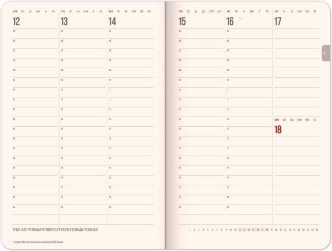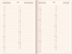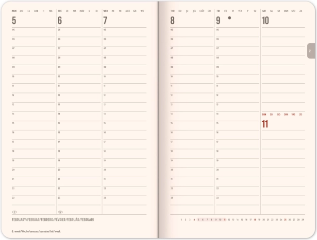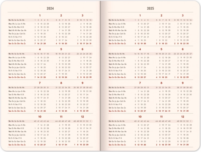 Il layout settimanale a colonne offre spazio sufficiente per le note ogni giorno. Nell'agenda trovi la panoramica delle festività internazionali, l'elenco dei nomi cechi e slovacchi, le panoramiche annuali 2024 e 2025, una pratica rubrica e una taschina sul risguardo posteriore per i piccoli oggetti.