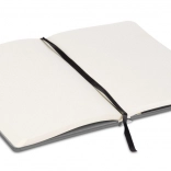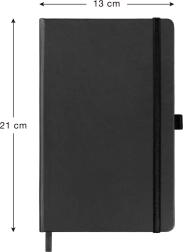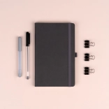 L'elastico mantiene il taccuino ben chiuso, il segnalibro in tessuto indica la pagina e il passante tiene la penna esattamente dove serve.