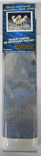 La pittura diamantata è un’attività creativa semplice e divertente, in cui con una penna applicatrice incolli piccole pietrine su una tela prestampata. Il motivo dei cavalli bianchi al galoppo risalta con un effetto scintillante e diventa un elemento decorativo in qualsiasi interno. Non servono abilità artistiche – basta seguire la legenda.