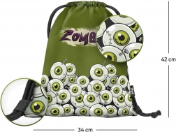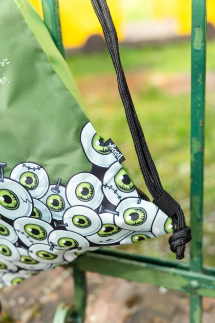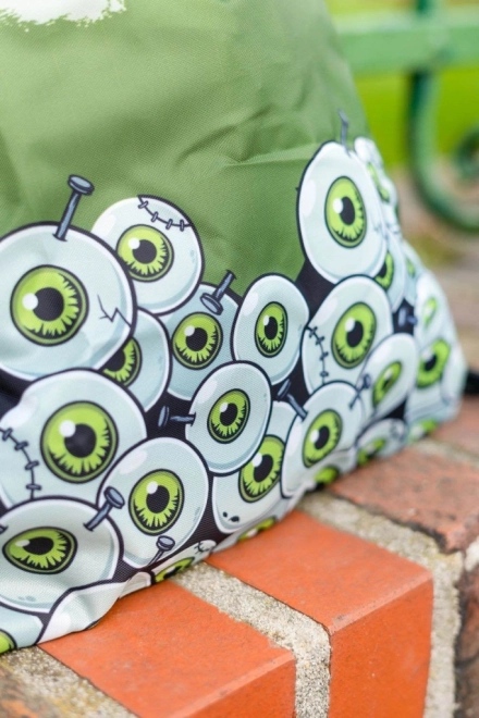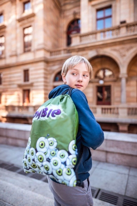 Lo zaino è coperto da una grafica di occhi verdi disegnati e la scritta 'Zombie', che attira l'attenzione e aggiunge personalità.