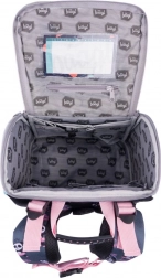 Il sistema di apertura a ribalta permette un accesso rapido ai libri direttamente dal banco. All'interno sono presenti una tasca trasparente con l'orario e un organizer con elastico per distribuire uniformemente il peso.