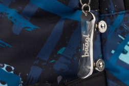 Elementi riflettenti e un ciondolo in metallo a forma di skateboard conferiscono allo zaino un aspetto unico.