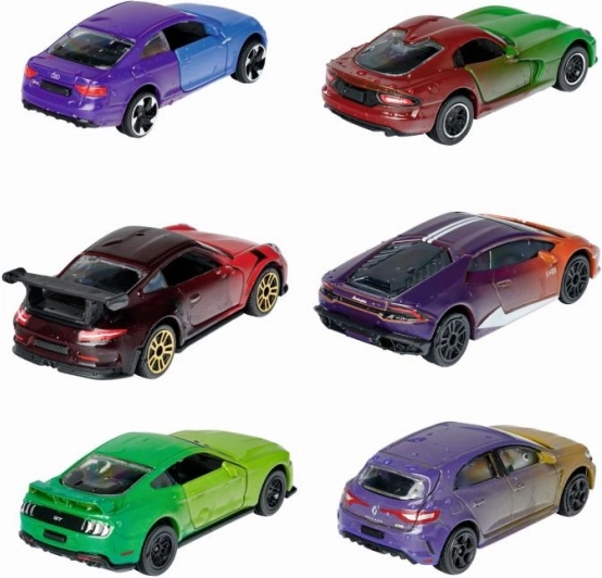 Nella serie trovi auto sportive iconiche come PORSCHE 911 GT3 RS, LAMBORGHINI HURACÁN, AUDI S5 COUPÉ, FORD MUSTANG GT, DODGE SRT VIPER e RENAULT MEGANE R.S.. Ogni macchinina è lunga circa 7,5 cm ed è inclusa anche una card da collezione.