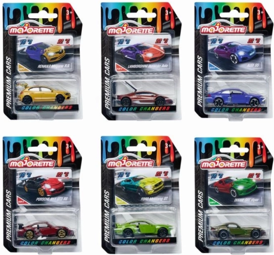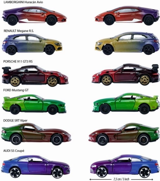 Scegli tra PORSCHE 911 GT3 RS, LAMBORGHINI HURACÁN, AUDI S5 COUPÉ, FORD MUSTANG GT, DODGE SRT VIPER e RENAULT MEGANE R.S. – ciascuno in tinte accattivanti e con effetto Color Changers.