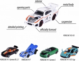Le macchinine sono realizzate con licenza ufficiale PORSCHE, con proporzioni realistiche, stampe autentiche e dettagli di carrozzeria evidenti.