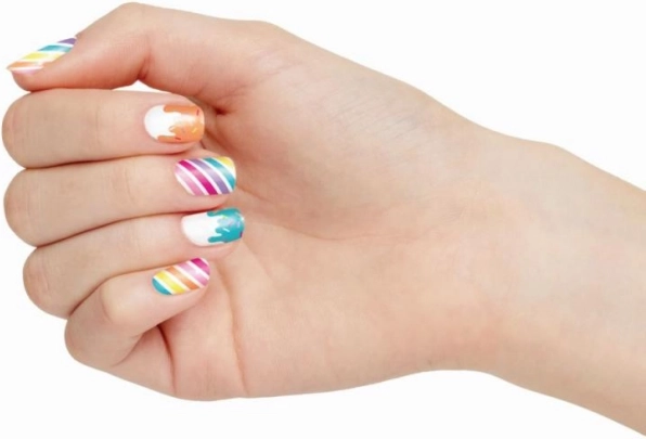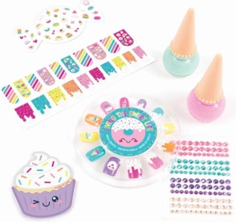 Il set per unghie Candy è la scelta perfetta per i giovani creativi che vogliono perfezionare il proprio stile personale. Include due smalti a forma di gelato a base d'acqua, facili da rimuovere con acqua calda e sapone. Questo set è completato da molti adesivi colorati e decorazioni che permettono di creare un look originale e giocoso per le unghie.