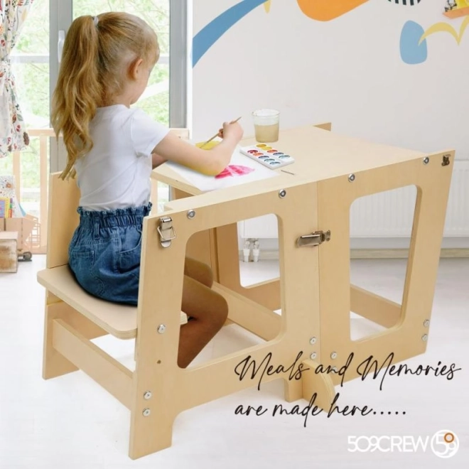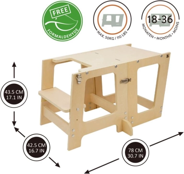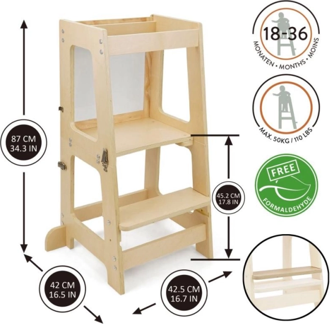 La torre di apprendimento Prema 3 in 1 è realizzata in compensato di alta qualità e resistenza, offrendo un facile montaggio e lunga durata. Dispone di 2 livelli di altezza (16,5 cm e 22,5 cm), per adattarsi facilmente alla crescita del tuo bambino.