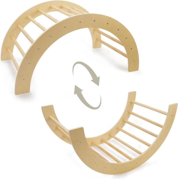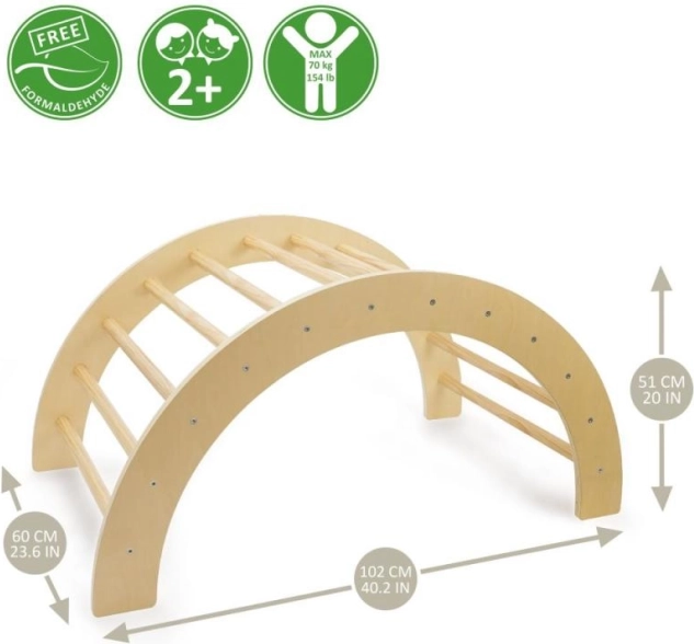 L'arco è realizzato in compensato naturale di alta qualità, completamente privo di formaldeide, garantendo sicurezza per i bambini. La sua capacità di carico massima è di 70 kg, consentendo un uso sicuro. Il montaggio è facile e veloce - potete farlo con una chiave a brugola inclusa. Il prodotto include anche un manuale d'uso chiaro e comprensibile. Ideale per bambini dai 24 mesi.