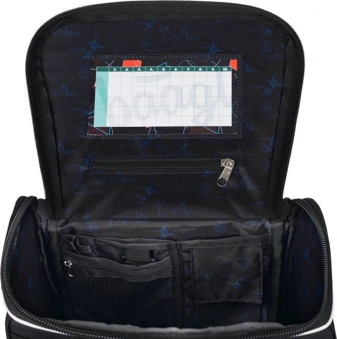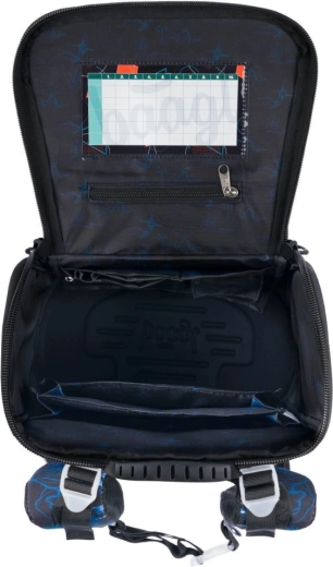 • All’interno è presente una tasca trasparente con l’orario e un organizer interno che consente una distribuzione uniforme del peso, completato da un elastico di fissaggio.