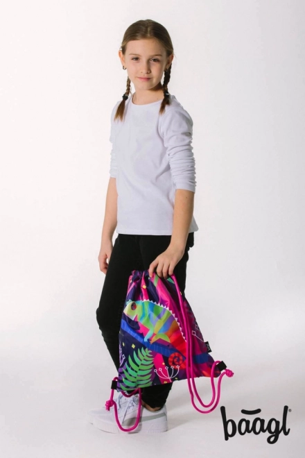 Il pratico sacchetto BAAGL con motivo camaleonte è ideale per le scarpe e i piccoli oggetti per il tempo libero. Realizzato in materiale robusto e lavabile e dotato di chiusura a coulisse con cordini resistenti, che consentono anche un comodo trasporto a zainetto.