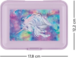 Scopri la scatola magica per il pranzo di colore viola con il popolare unicorno sul coperchio. Pratica e sicura per i bambini in viaggio.