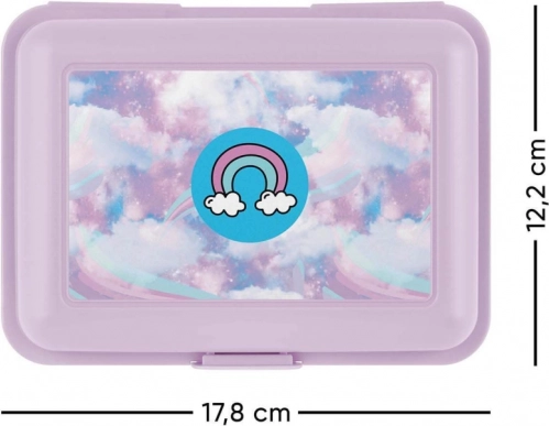 La scatola in plastica viola offre un aspetto divertente e moderno, allineato con il motivo gioioso di nuvole e arcobaleni, che la rende ideale per i bambini.