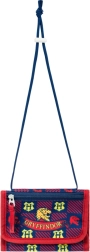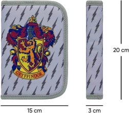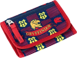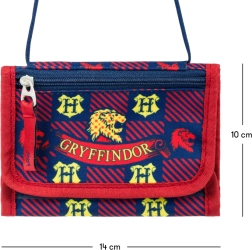 Astuccio a due alette, sacca per scarpe di ricambio con tasca frontale con zip, cartelline porta quaderni e portafoglio da collo – tutto nei colori e con lo stemma di Gryffindor.