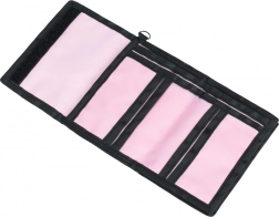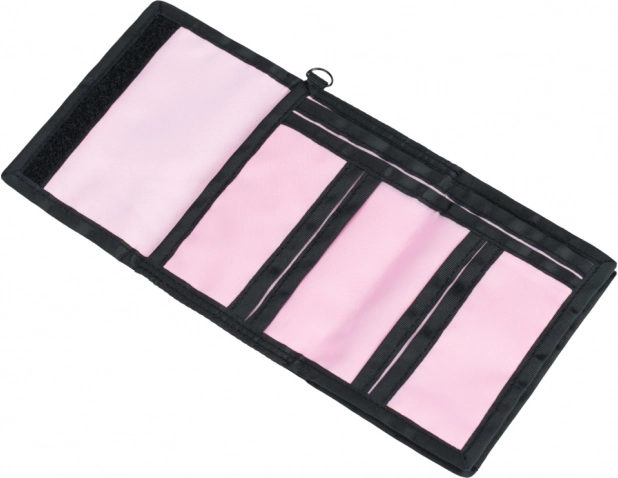 Dispone di diversi scomparti, compreso uno trasparente per le carte e tasche con cerniera per i contanti.