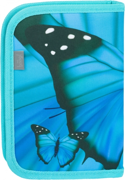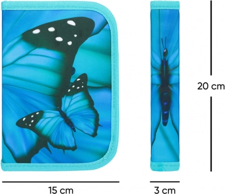 Elegante astuccio in blu turchese con un evidente motivo di farfalla che unisce stile e funzionalità. Grazie alle due alette interne, ai supporti elastici e alle tasche, avrai sempre strumenti di scrittura e piccoli accessori scolastici ben organizzati e al sicuro con chiusura a cerniera.