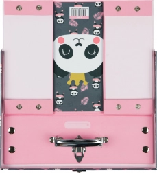 Il manico in metallo è comodo da impugnare e la classica fibbia mantiene il contenuto ben al sicuro. Perfetta per materiale artistico, quaderni, piccoli giocattoli o tesori da viaggio. Il dolce motivo panda e le tonalità rosa la rendono un accessorio amatissimo per la scuola e per le gite.