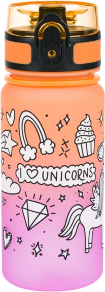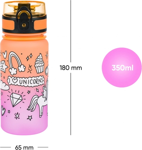Elegante borraccia in Tritan da 350 ml con motivo unicorno e gradiente di colore, ideale per la scuola, le gite e lo sport. Offre un coperchio con chiusura di sicurezza, un comodo laccetto per il trasporto e un filtro interno per frutta o erbe. Realizzata in Tritan certificato privo di BPA, senza odori e adatta anche a bevande calde.