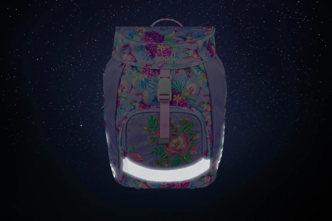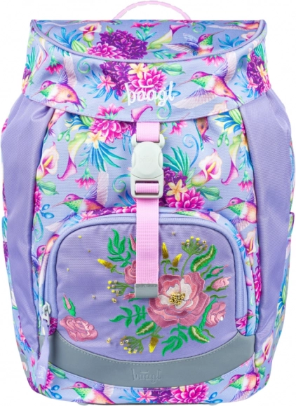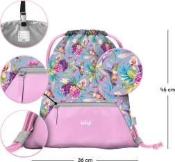 - Design: motivo giocoso con colibrì e fiori; zaino, astuccio e sacca coordinati.