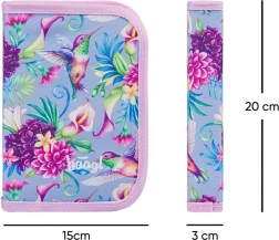 Astuccio a un piano con due alette (senza contenuto) e sacca resistente con taschina inferiore con zip e moschettone per fissaggio allo zaino – tutto nel motivo Colibrì.