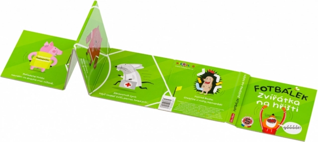 Leporello per i pif9 piccoli, che offre una visione divertente e colorata di una partita di calcio tra animali sul campo. Ideale per bambini curiosi.