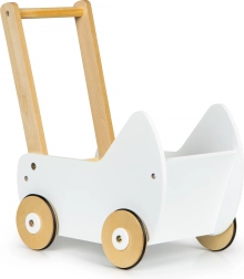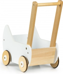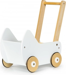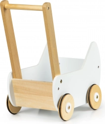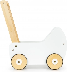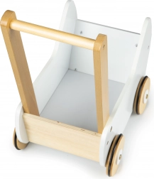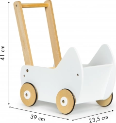 La carrozzina è completamente realizzata in legno e rivestita di pittura sicura per i bambini. La struttura stabile è priva di spigoli vivi, il che garantisce sicurezza durante il gioco.