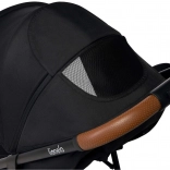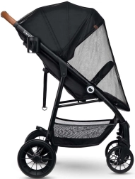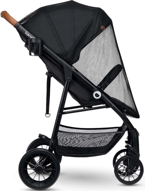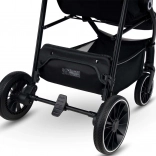 La capottina XXL con rete di ventilazione protegge dal sole e dal vento; i materiali idrorepellenti sono facili da pulire; la sicurezza è assicurata da cinture a 5 punti regolabili, barra paracolpi amovibile e inserti riflettenti. I genitori apprezzeranno la chiusura rapida con blocco antiapertura accidentale, il maniglione ergonomico in eco‑pelle, il capiente cestello e gli accessori pratici.