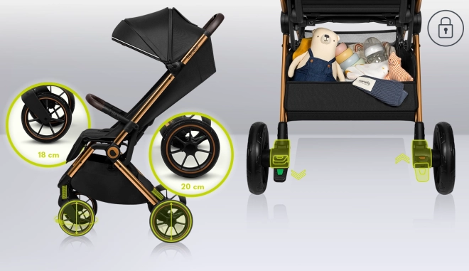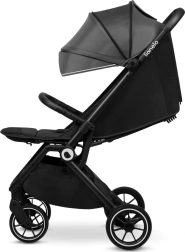 Per il massimo comfort del bambino non mancano schienale regolabile fino alla posizione distesa, poggiapiedi regolabile in ecopelle e capottina XXL impermeabile con filtro UPF50+ e finestrino. I genitori apprezzeranno la chiusura automatica a pulsante, la pratica cinghia per il trasporto, il cestello capiente (portata 3 kg) e il sistema click&ride per un passo comodo e il sicuro freno a pedale.