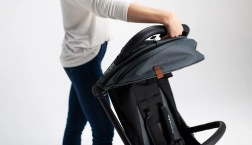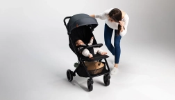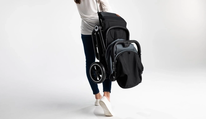 Con la pressione di un pulsante, il passeggino si richiude in un formato compatto e, grazie alla tracolla, si trasporta facilmente sulla spalla – ideale in città e in viaggio.