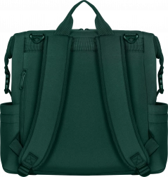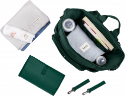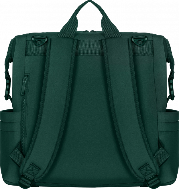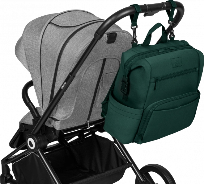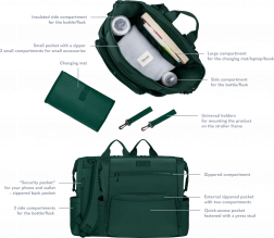 Lo zaino può essere portato sulla schiena, fissato al passeggino tramite cinghie universali rimovibili oppure utilizzato come accessorio a sé stante. La tasca per il fasciatoio funge anche da scomparto per tablet o laptop, mentre le tasche laterali e interne mantengono tutto a portata di mano. Grazie alle cinghie è possibile ridurre le dimensioni in modo che lo zaino entri anche sotto il sedile dell’aereo.