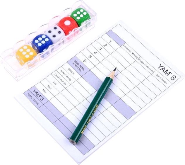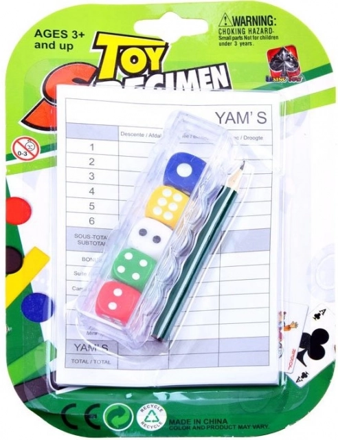 La confezione include 5 dadi colorati con un blocchetto per annotare i punti e una matita. Dimensioni del dado: 1,5 x 1,5 x 1,5 cm. Un gioco amato sia dai bambini che dagli adulti. L’obiettivo del classico gioco dei dadi è ottenere il maggior numero possibile di punti. Il set comprende: 5 dadi, blocchetto per segnare i punti, matita, contenitore di plastica per i dadi. Adatto a bambini dai 3 anni in su.