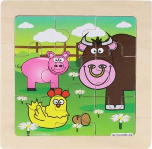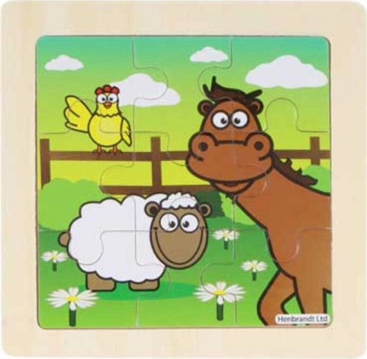 Puzzle per bambini in legno. I pezzi sono posizionati su una tavoletta di legno con bordo fresato per facilitare l’assemblaggio. Mettere insieme il puzzle stimola la fantasia e favorisce lo sviluppo della motricità. Dimensioni del puzzle composto: ca. 9 x 9 cm