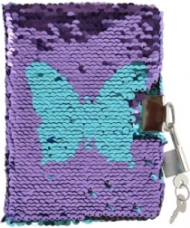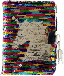 Diario segreto alla moda con paillettes double-face che cambiano aspetto e colore passandoci la mano. Per maggiore privacy il diario ha un lucchetto metallico con chiavette, all'interno pagine bianche non rigate per scrivere e disegnare. Le dimensioni compatte 11 × 15 × 2 cm lo rendono ideale per la scuola e per i viaggi. Fornito in mix di motivi e colori in base alla disponibilità di magazzino.