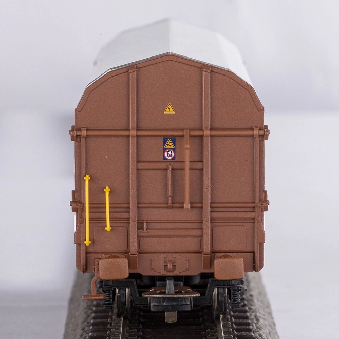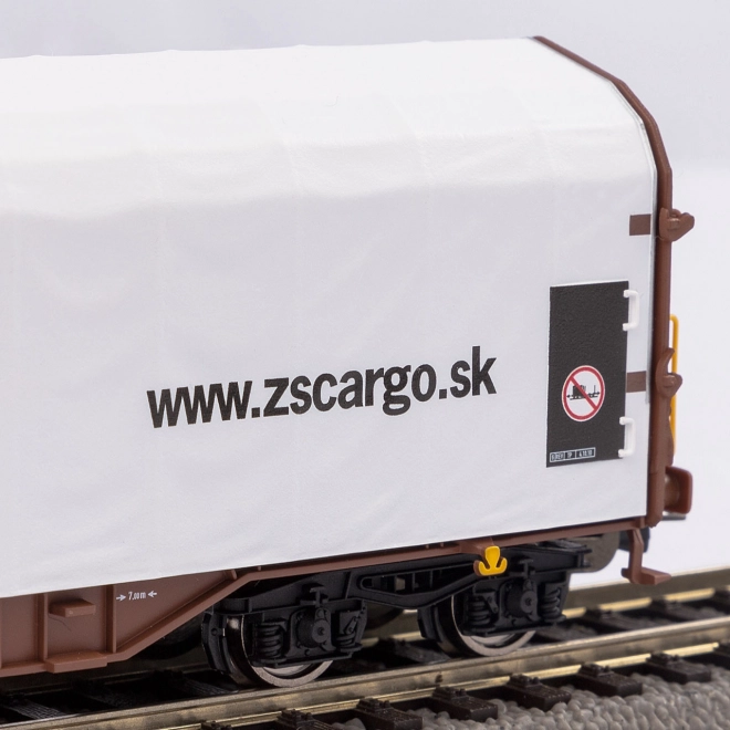 Coppia di vagoni coperti a quattro assi Shimmns, lavorati con precisione della compagnia ferroviaria Slovacchia, ideali per il trasporto di rotoli di lamiera. Grazie al coperchio rimovibile, puoi facilmente esplorare lo spazio interno complesso e godere dell'estetica dei dettagli.