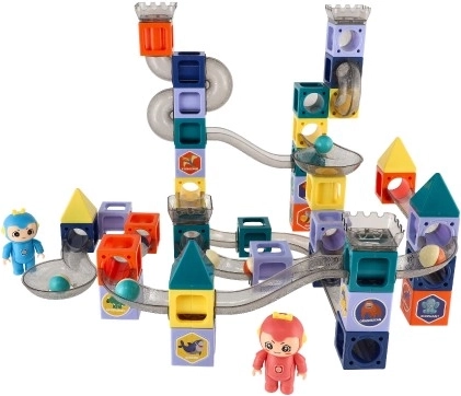 Blocchi, rampe e accessori vari consentono di assemblare sempre nuove piste per biglie. I bambini scoprono così i principi di gravità e velocità in modo divertente.